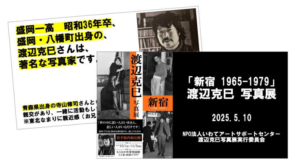 藤澤貢さん(昭和61卒)が中心となって、著名写真家故渡辺克巳さん(昭和36卒)の写真展の準備が進んでいます。2025年5月10日の在京白堊会総会・懇親会で藤澤さんから熱い告知がありました。