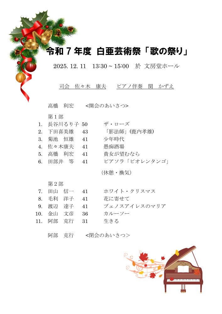 - 11日 高橋利宏さんと有志による「歌の祭り」