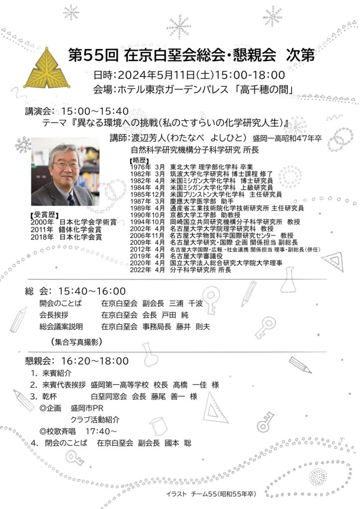 - 渡辺芳人さんの講演及び総会の後、懇親会は高橋盛岡一高校長の挨拶、藤尾白堊同窓会会長の乾杯で始まりました。