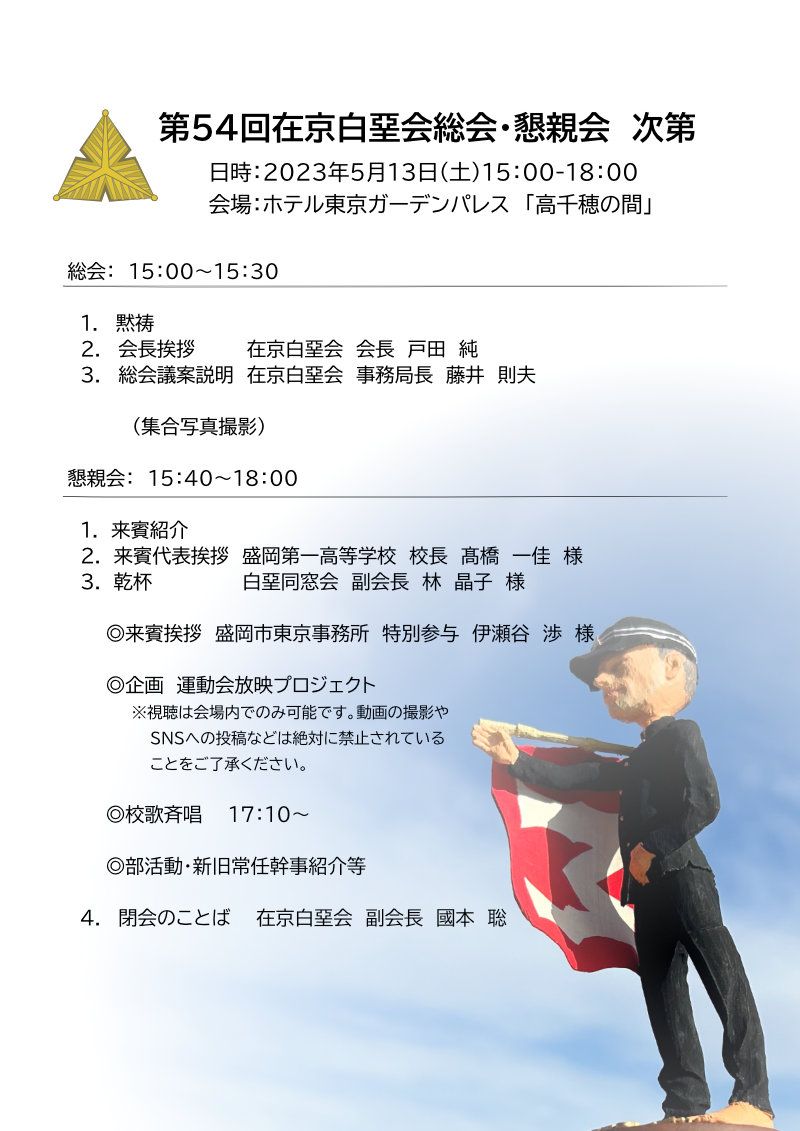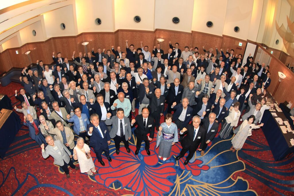 懇親会では、同日盛岡の母校で行われた大運動会の様子が放映され、 現在の後輩の活躍ぶりに心躍ると共に、往時を懐かしく思い起こしました。 その後、生の旗振りと和太鼓に合わせて全員で高らかに校歌を斉唱するなど、 大いに盛り上がりました。