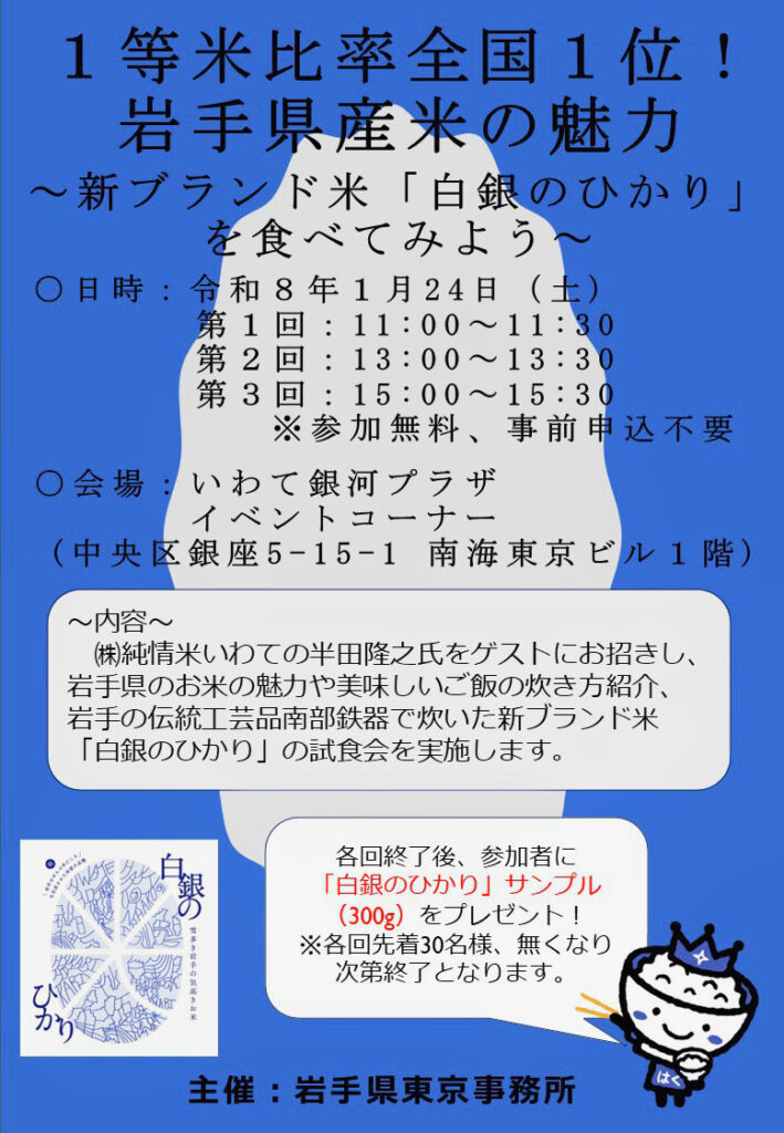 いわて銀河プラザで「白銀のひかり」関連イベント開催!1月24日(土)にいわて銀河プラザ(東京・銀座)で岩手県のオリジナル新品種「白銀のひかり」の関連イベントが開催されます!「白銀のひかり」は粒の大きさと炊き上がりの白さ、味の良さが魅力です✨@IwateGingaPlaza pic.twitter.com/5rdg4vXaU5— 岩手県 県北広域振興局 (@iwate_kennpoku) January 7, 2026